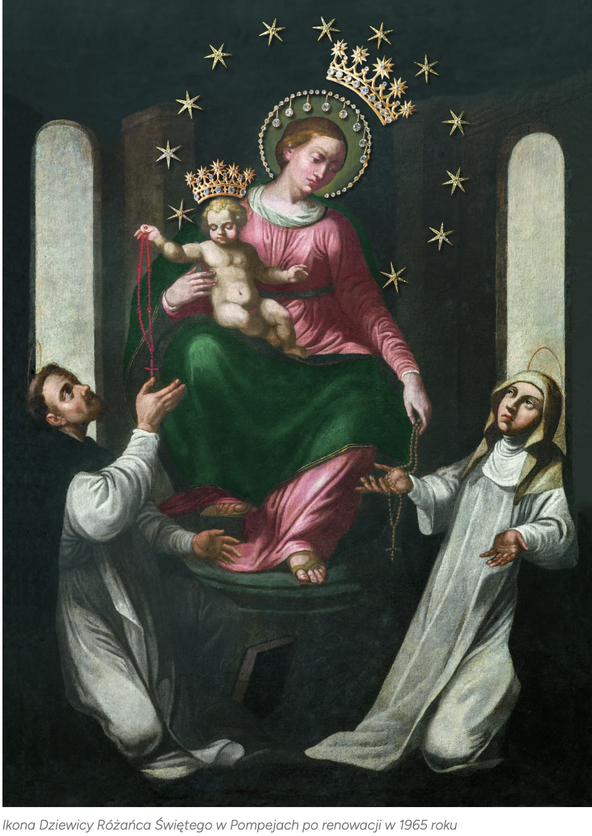 a następnie wybitnemu neapolitańskiemu malarzowi, Federico Maldarelliemu. Obraz stał się bardziej harmonijny dzięki domalowaniu brakującego fragmentu nad głową Dziewicy. Ponadto obecną na obrazie św. Różę ze Limy zastąpiono św. Katarzyną ze Sieny, która była szczególną patronką Bartolo Longo.